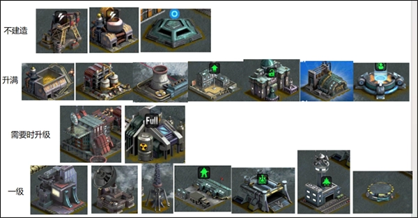 -资源类建筑主要有金属库、石油库、铀库和发电站。建议金属库和石油库只要满足升级条件就尽量升级,铀库和发电站则根据实际需求再进行升级。在游戏前期,建造两座金属库,再搭配石油库与发电站就足够使用了。另外,冶炼厂和油井不建议升级,更不建议建造!