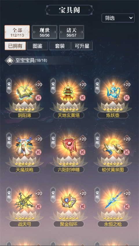每个被动宝具都具备一种基础属性与一种被动效果,升级宝具能够增强其基础属性,而宝具升星则可以提升其被动效果。