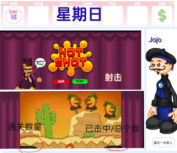 射击:在射击关卡里攻击敌人就行,左边显示的是通关所需的数量,右边则是已经击中的个数。