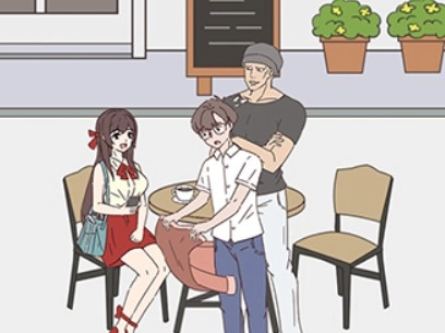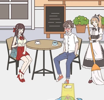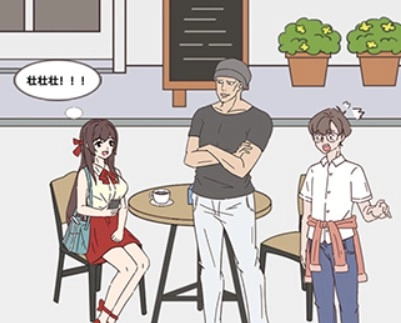 点击左侧的椅子,再点击右侧的椅子,接着点击服务员手里的菜单,然后把它递给女神。