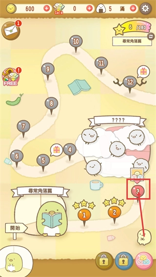 进入【寻常角落篇】关卡界面后,可点击标红的数字节点推进关卡,同时留意界面资源数值。