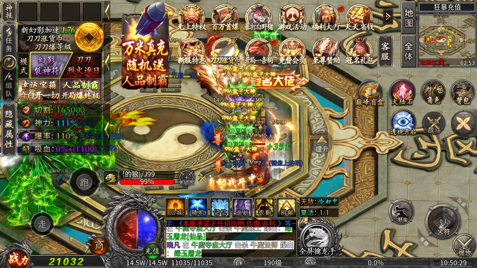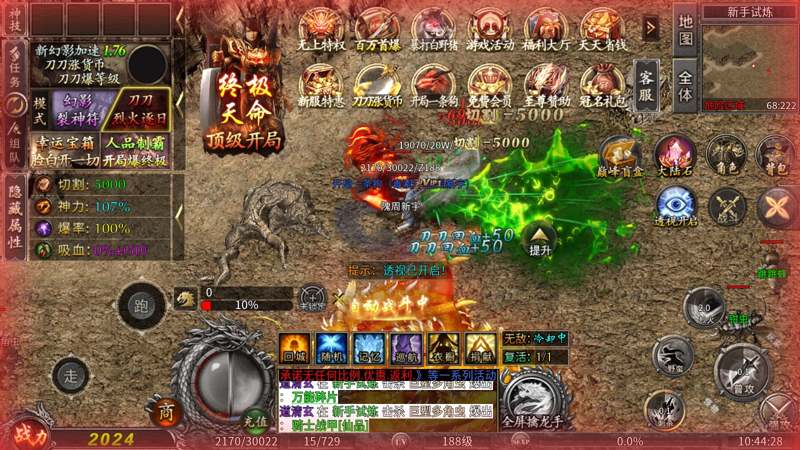 魔河攻速拉满无限刀,176神器无限刀版本来袭!上线就送毒素神兽、幻影火符,刀刀烈火逐日不停歇,自动回收功能加持,开荒打宝超轻松,升级毫无压力!从新手村到终极地图遍地是BOSS,所有装备全靠手打,特殊神器照样能爆!9999万血量的怪物爆率拉满,欧气附体就能爆出一切!散人玩家也能轻松圆梦,花时间就能逆袭成大佬!