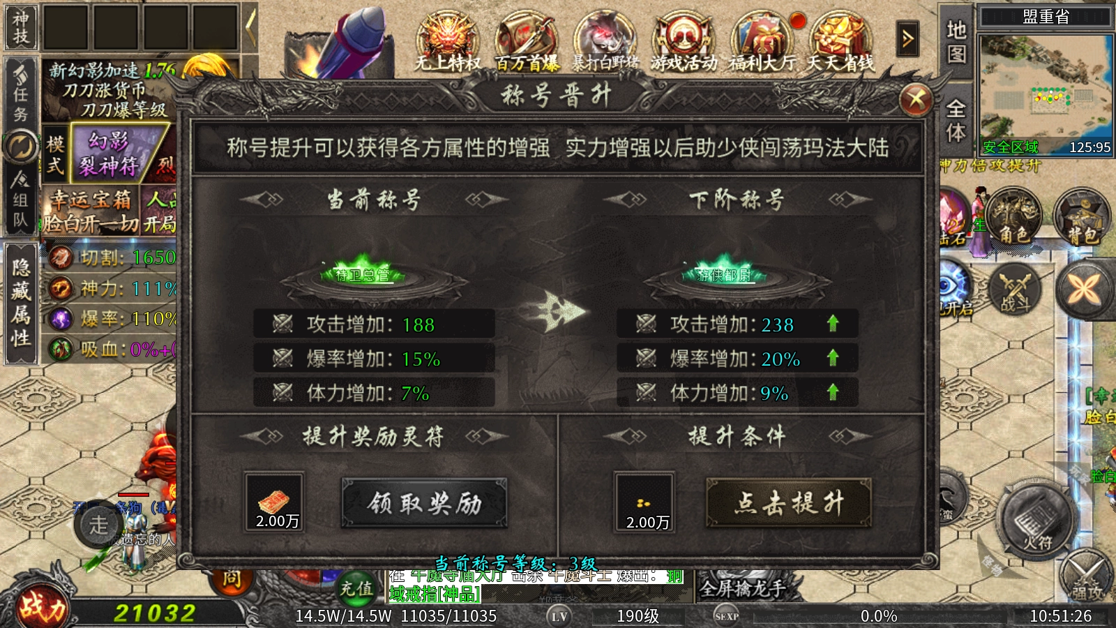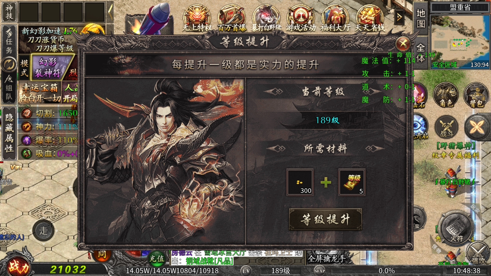 等级提升规则:当角色等级达到188级后,需前往指定NPC处,消耗一定数量的金币与等级卷轴来完成等级晋升,每次升级都会带来角色属性的相应增长。