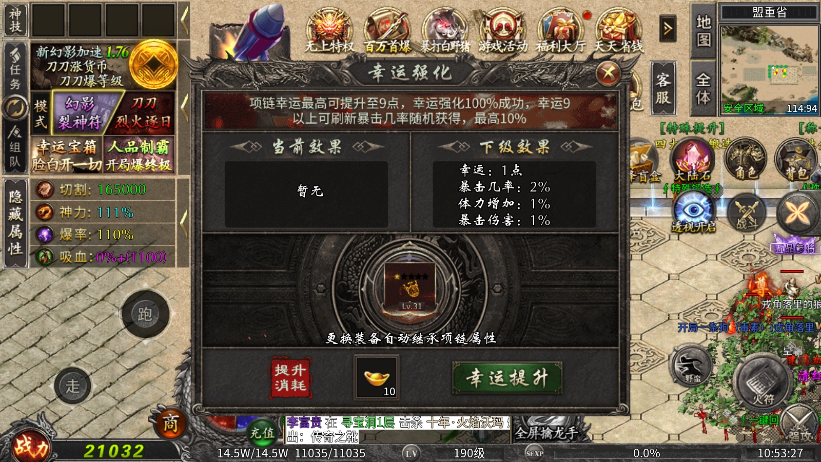 幸运强化机制调整如下:项链的幸运值上限提升至9点,此阶段内进行幸运强化可确保100%成功;若想突破幸运9的阈值,需通过刷新暴击几率的方式随机获取,单次刷新最高可获得10%的暴击几率加成。