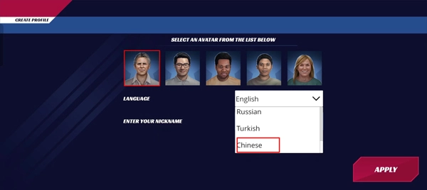 在角色选择界面的下方有一个选项,点击它并选择“chinese”,完成选择后界面就会切换为中文显示了。
