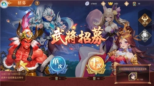 其实不用太纠结武将的获取问题,随着游戏任务的逐步推进,招募卡会源源不断地获得。加上高爆率酒馆招募的加持,组建一支全橙将的队伍其实是很轻松的事情。虽然游戏里招募规则写着十连必出紫将或更高品质的武将,但实际上几乎每次十连都能抽到橙将。另外抽卡的时候建议不要用元宝,直接使用各种活动发放的招募令就可以了。