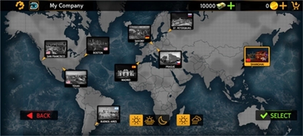 你可以挑选自己想去的地区,游戏里包含多种现实中的城内与城外地图,像美国的旧金山和德克萨斯、南美洲的布宜诺斯艾利斯、欧洲的德国、西班牙、布拉格、圣彼得堡,还有迪拜、上海等地;另外,也能在下方选择当前地区一天里的不同时间以及天气状况,点击SELECT按钮就可以了。
