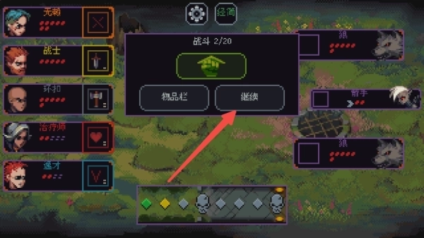 击败一个小回合的敌人后点击继续;