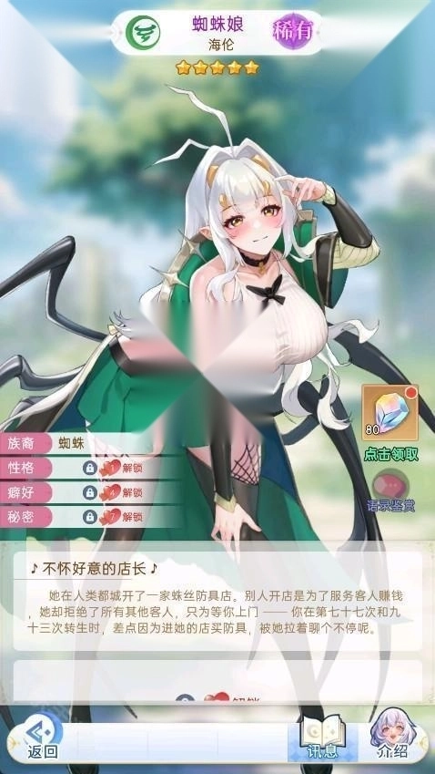 在人类的都城,她经营着一家蛛丝防具店。不同于寻常店家开门迎客、以盈利为目的,她将所有其他顾客都拒之门外,只为等待你的到来——你在第七十七次与九十三次转生的轮回里,曾两次险些因踏入她的店铺购置防具,被她拉住絮絮叨叨地聊个没完呢。