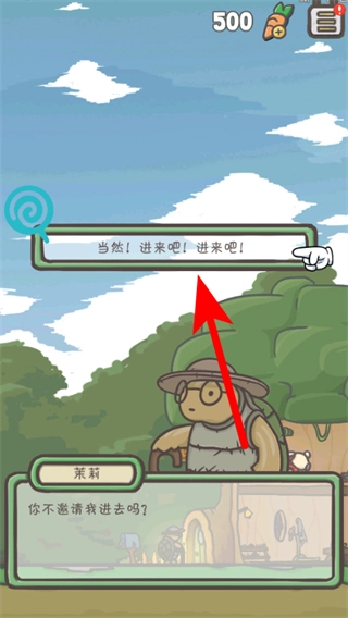 和角色莱莉进行互动,点击她的对话气泡“当然!进来吧!进来吧!”,以此推动剧情对话的进展。