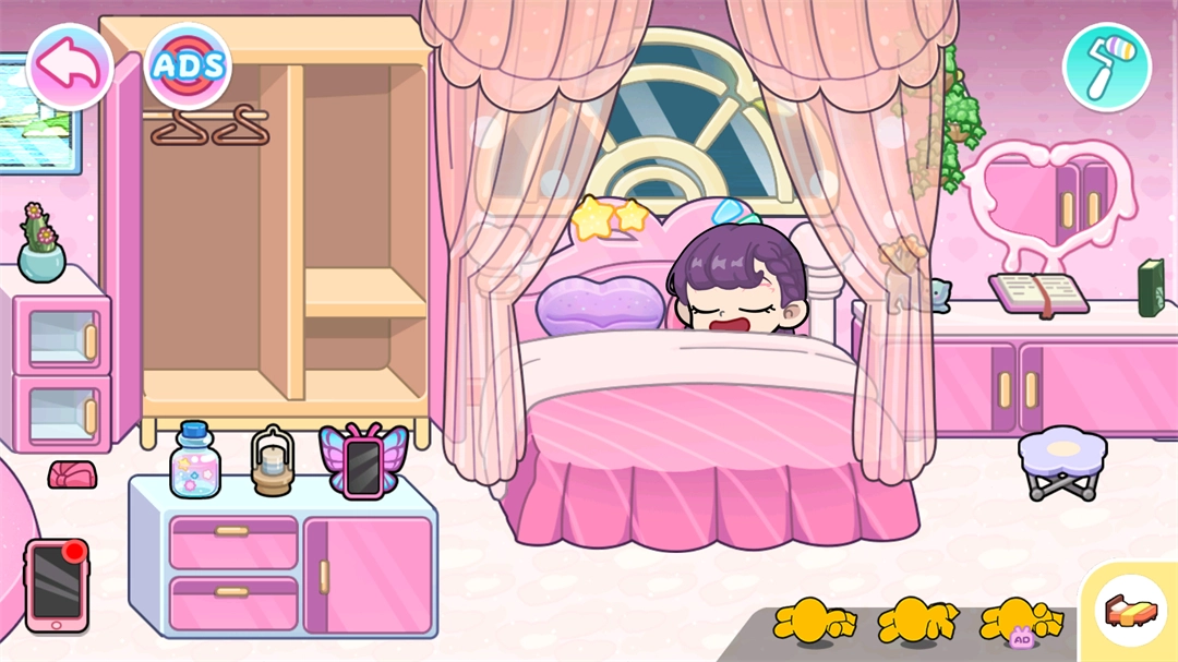 画面里的每样事物都支持互动,举个例子,要是把角色安置到床上,她就会进入睡眠状态。