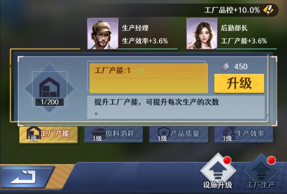 工厂等级提升至3级后,可任命员工担任后勤部长一职,此举能提升工厂的产能,也就是在相同时间内增加产品的产出数量。