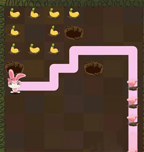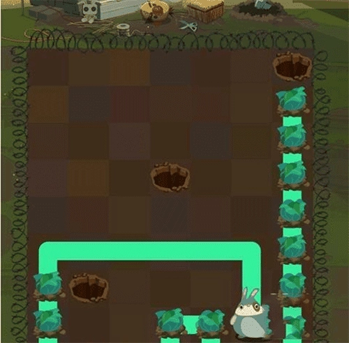 核心玩法机制在于一笔完成的路径绘制:从起始点开始,全程不中断、不重复、不回头,引导兔子沿着画出的路线吃完所有指定作物,最后顺利到达洞口。这看似只是简单的一笔操作,实则对空间布局的预判能力和行动顺序的规划能力都提出了双重挑战。