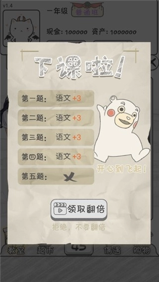 5、玩家需持续答题学习,直至语文、数学、英语课程得分均达到60分以上,并且“日历”天数已点至0,此时即可升级年级。这相当于模拟了现实中的学期结束且期末考试及格的情景,趣味性十足。