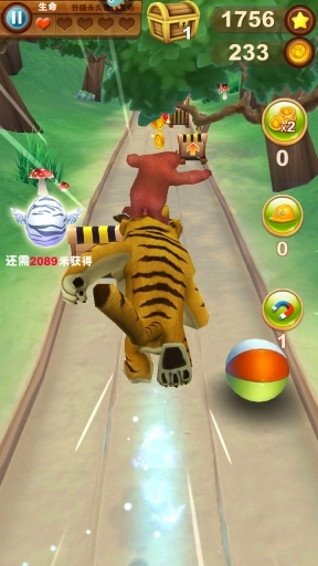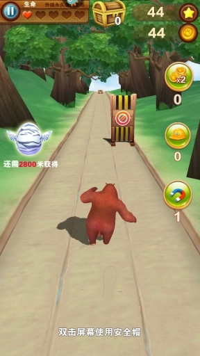 游戏操作简单,跟普通的跑酷游戏差不多,玩家只需向上滑动屏幕,便可控制熊大跑动或者跳跃,越到低障碍时,向下滑动屏幕,便可操控熊大向下滑行躲避障碍。简单的操作,玩法却充满了挑战,一路不断出现的各种障碍,实在让小编头疼,在躲避它们的同时,还要尽可能的吃到沿路的金币,但是金币虽好,可不要贪心哟,学会避重就轻才是跑酷游戏的关键,如果光想着吃金币而忽略了一路的障碍,撞击费血,那就得不偿失了。