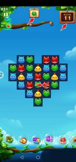 注意,如果动物消除后上方的动物坠落,形成横排或竖排有三个相同的动物,系统会再次自动消除而无需我们操作。