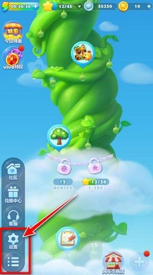 4、现在教大家如何绑定微信或者QQ账号,来到开心消消乐主页面之后,我们点击左下角的菜单图标选择设置