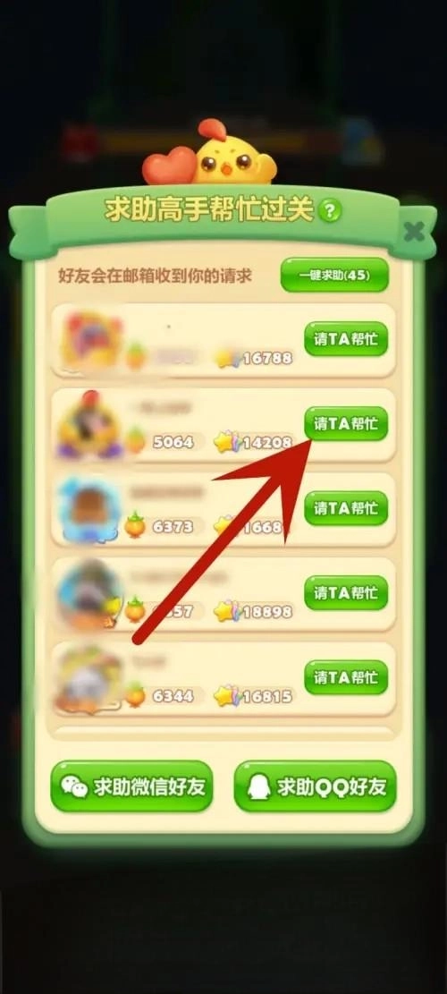 2、选择要代打的好友,点击后面的“请TA帮忙”,好友同意后,就可以帮你过这关了;