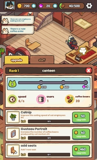 3、您可以通过 培训 和提升猫咪们的技能来提高生产 效率 ,制作更多口味独特的咖啡。