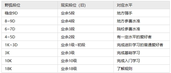 按以前的标准,4段以上的野狐段位/2=现实段位。野狐9段相当于现实中平均水平的业5;8段相当于标准的业4;7段相当于较强的业3……以此类推,4段相当于标准的业2。