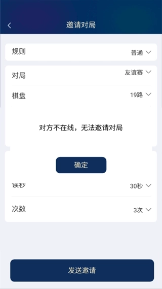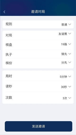4、然后再设置对弈规则、对局模式、棋盘路、执子规则、棋份、局时、秒读和次数,最后点击邀请就可以啦!