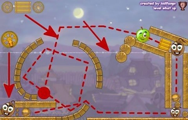 2、第二关时将第一个车轮放在最左边的炸弹上方,之后就会按照图中的路线运动,等到橙子到达途中红色圆的位置是将木块放到环形木圈的上方,最后将车轮环形木圈右方。