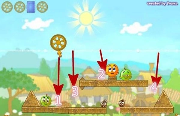 3、第三关先将车轮挨着橙子放到1号位置,这时车轮会滚到间隙中橙子也会到右边,然后将第二个车轮放到2号位置,接着一次将铁通和车轮放到3号、4号位置就完成了。