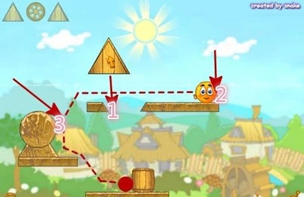 5、第五关先将三角木块放到1号位置,注意距离间隙要有点斜这样三角木块才能平放,然后用车轮将橙子推到下方,注意要按顺序,否则橙子会滚出去,最后将三角木块放到3号位置,等待胜利吧!