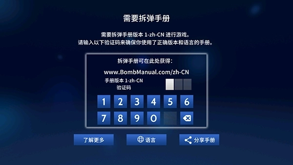 首次打开游戏时,你会看到一个提示界面,要求输入验证码,这是为了确认你使用了正确的拆弹手册。