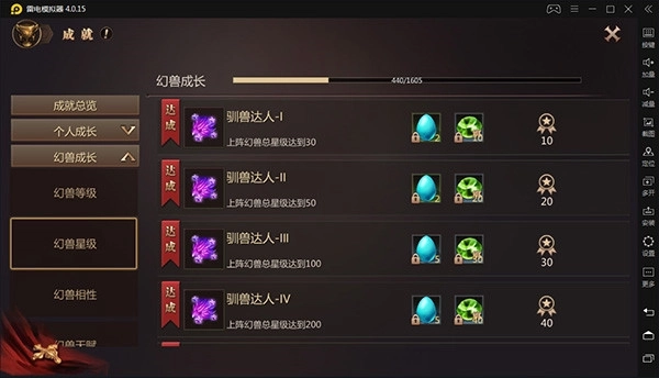 幻兽成长则是针对幻兽玩法,比如幻兽的等级、星级、相性、天赋、进化等方面。同时大家拥有的幻兽种类,也可以完成极品幻兽成就。