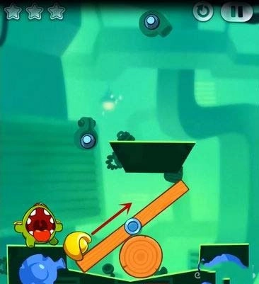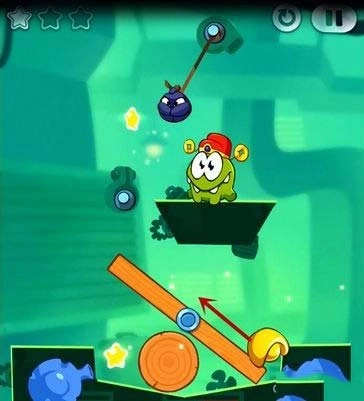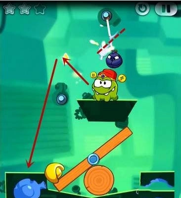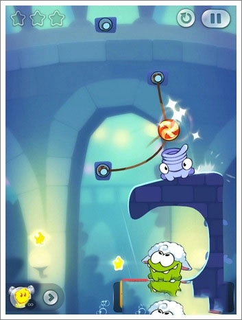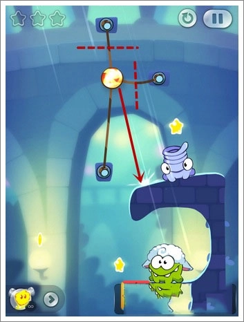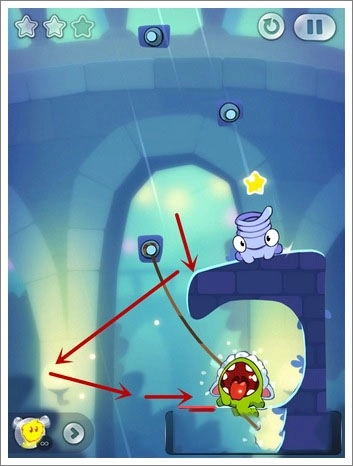 技巧:这一关通过额外任务的只有一个方法,不过运气成分有点高,主要是切割糖果上面和右边绳子的相隔时间,掌握一个时间间隔就能快速掉到下面的石壁(而不被Toss抓到),进行一个反弹,然后收集两颗星星并过关。