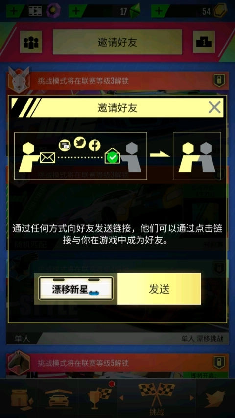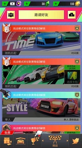1、打开绝尘漂移官方最新版,点击挑战,点击上方邀请好友;