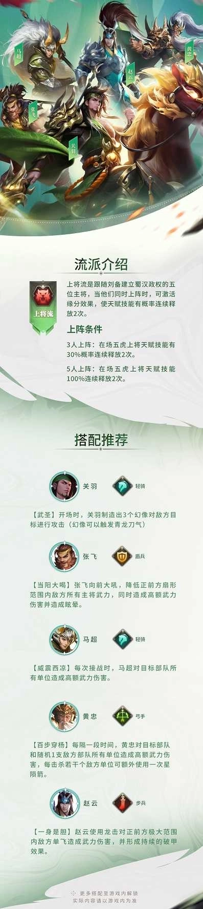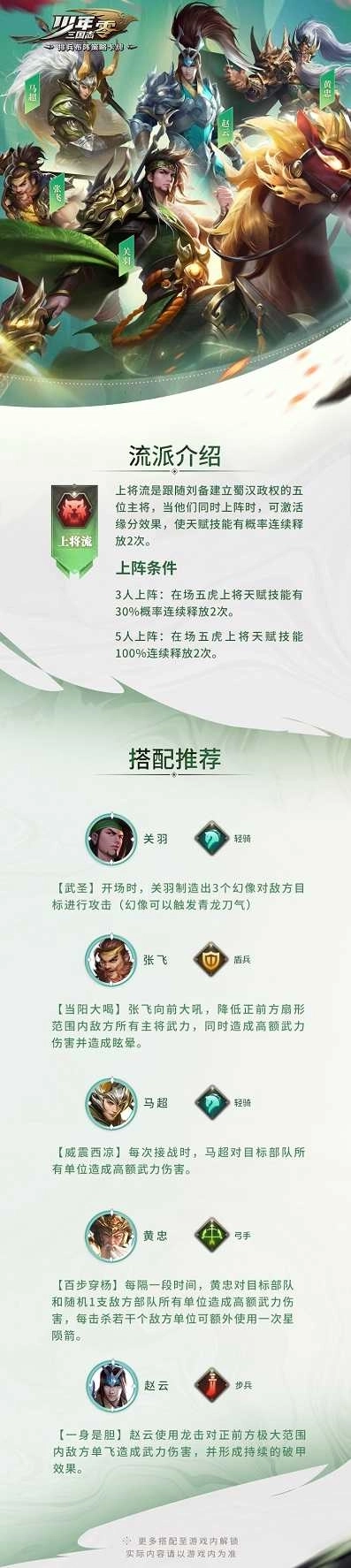 而在《少年三国志:零》中,关羽同样也是上将流的中坚力量。在同场战斗中,若上将流的5位武将有3人上阵,在场3人将额外提高20%伤害;有5人上阵,则伤害效果扩大至己方所有主将。