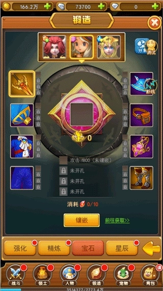 每达到十级就可以多镶一个孔位最多三个孔位,需要宝石开孔钻5000钻石一个,或者参与公会活动兑换每日限购一次。