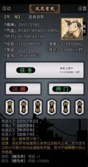 3、游戏以文字的形式为玩家呈现一个真实有趣的江湖世界。在江湖上玩有各种各样的方法。在江湖上,球员很容易成为传奇。