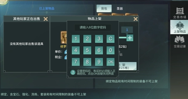 鉴于游戏内不存在独立的交易系统,交易行特此增添了道具上架加密功能。在上架道具时,玩家能够设置6位数字密码。当其他玩家想要购买该道具时,必须输入与之相同的密码方可完成购买操作,若不知晓密码,则无法购买此道具。如此一来,玩家再也不必担忧物品被抢的问题啦!只需将密码告知好友,好友就能顺利购买道具。
