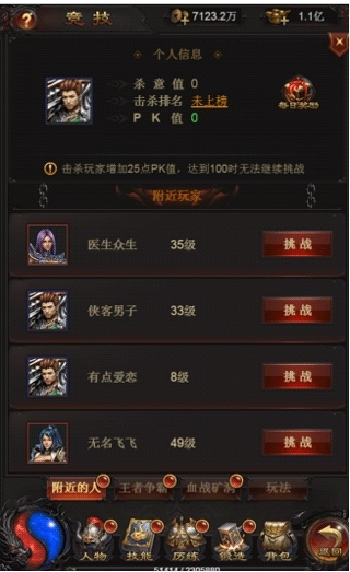 d.玩家可以在界面中查看自己的竞技排名,挑战其他玩家可以获得杀意值,提升自己的竞技排名。