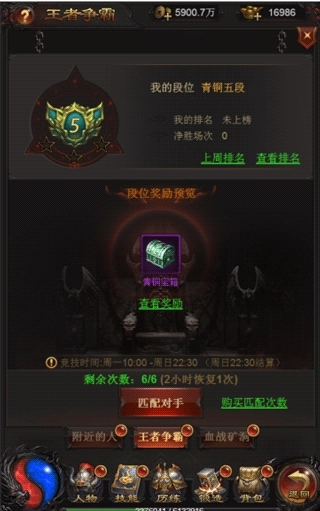 c. 每周日22:00,王者争霸进入休战期,期间玩家无法进行匹配。每周日22:30,系统将结算本周的王者争霸段位奖励,并通过邮件发放。所有玩家的段位将被重置,下周一10:00重新开放挑战。
