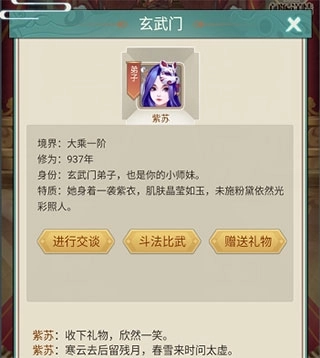 在各门各派中,异性角色皆可发展为道侣。在游历不同门派时,你还能与他们交流互动,通过赠送礼物增进感情。切记,目光要远大,不能只盯着门派的功法和秘术!