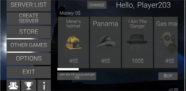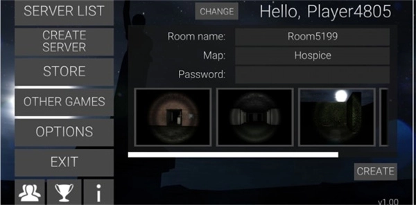 1、第一步,我们进入瘦长鬼影计划online手游联机版。游戏界面中,第一个选项是房间大厅,第二个是创建房间,第三个为道具购买,其余部分暂时无需理会。