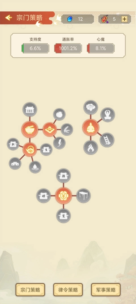 4、启动游戏后,你需通过推行各类政策来赢得支持、扩展领地,指挥精锐门派弟子抵御敌军,运用灵活多变的策略将敌人逐出这片区域。