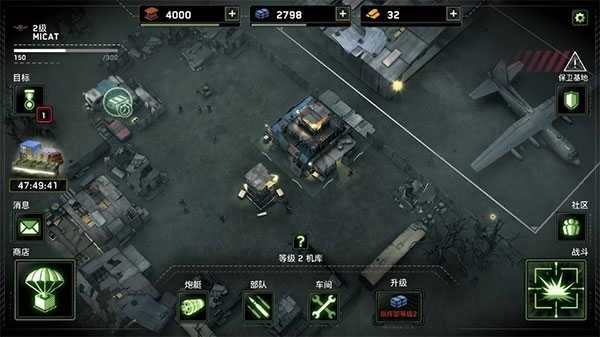 开启任务后,首先要设置「部队部署」的位置。红圈所圈定的高塔区,禁止在此处部署。建议留意「可掠夺资源」周边的建筑,测算每个障碍物与资源点之间的距离,同时明确任务目标的具体要求,尽可能达成目标,从而获取更多资源。当然,前期的任务都相对容易完成,获得的宝箱能够开出5.56毫米机枪、MP5冲锋枪或者火炮等装备,还有等级经验。点击「战队图标」,就能查看所有武器和设施,其中红色标识代表尚未获取。