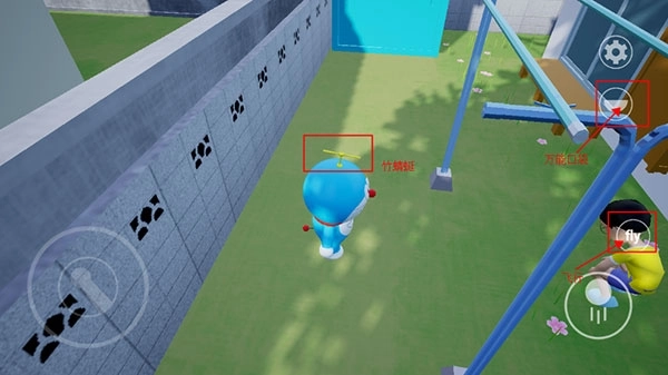 4、如图片所示,点击哆啦A梦的万能口袋,我装备上一个竹蜻蜓后,右下角会出现一个“fly”按钮,点击该按钮就能起飞。