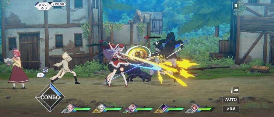 战斗系统十分简单,开启后会以半自动模式进行(新手教学完成后,能直接切换至全自动并开启两倍速)。在与敌人自动交互攻击的过程中,玩家可使用画面左下方随机挑选出3人的Strike Combo技能,该技能按照先后顺序会附加越来越多的Buff,也能使用各角色的必杀技。此外,通关后会解锁扫荡机制,以此加快等级提升的速度。