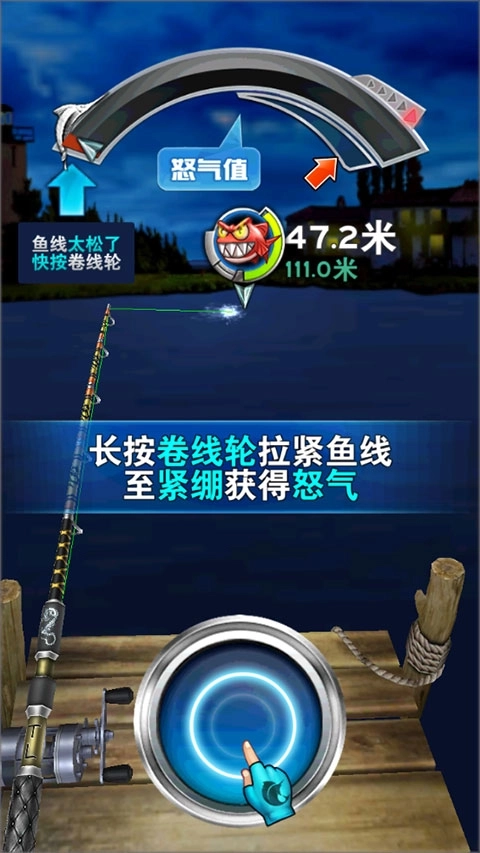 5、长时间按住卷线轮,将鱼线拉紧直至呈现紧绷状态,这样就能获取怒气,拥有怒气后,你钓到鱼的几率会大大增加。
