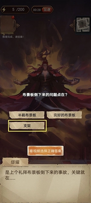 ⑵布景板倒了→相关线索→【半截布景板】、【支架】、【布景板】