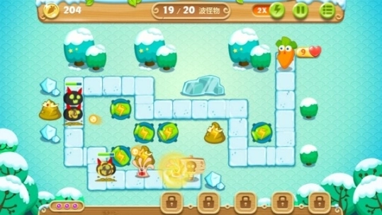 4、第四波大萝卜放在正下方放火炮的地方,这个位置是本次关卡里面重要的地方,机关被冻住的时候可以快速进行清理,左侧障碍也靠这个火炮清理。