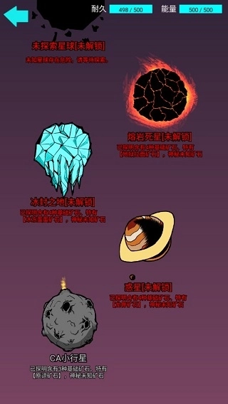 3、无尽的冒险玩法,你将会遇到各种类型的星球,不断的收集物资。
