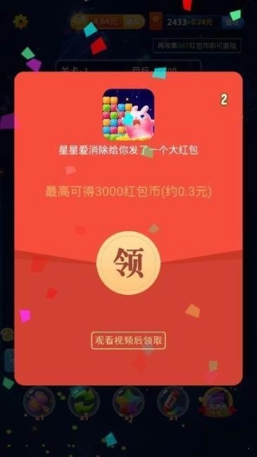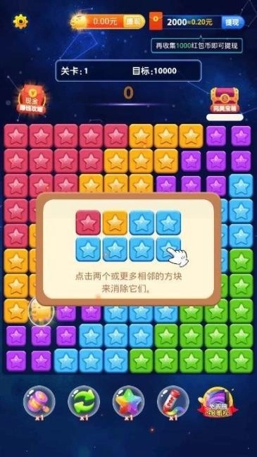 星星爱消除红包版,一款超有趣的休闲益智佳作。它玩法多样,凭借灵活的指尖操作就能闯过重重关卡。每次消除的方块越多越好,而且消除过程中还能赢取红包奖励。游戏内道具丰富,采用经典的三消玩法,消除特效十分酷炫。其游戏画面简约,刻画细腻,关卡设计丰富。玩家只需轻松点击,就能消除相连的同色方块,还能合理运用技能与趣味道具。喜爱星星爱消除红包版的玩家,赶紧下载来体验一番吧!