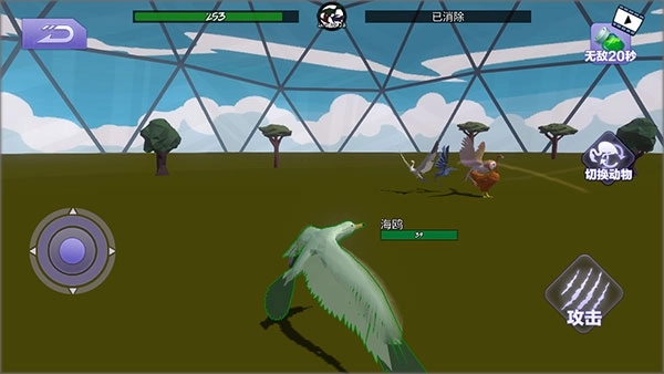 1、成功下载并安装游戏后,进入游戏界面。在游戏中,通过左边的轮盘操控角色移动,点击右边的按钮实现攻击动作,点击右侧“切换动物”的选项,就能操控其他动物继续游戏。当把场上除自己以外的所有敌人都消灭掉,便可赢得胜利。